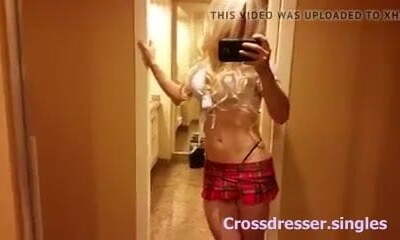 ladyboy asiática coed vestida con su uniforme universitario mientras se masturba