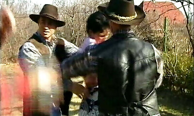 T-girl and mature lady give blowjob to a guy before the ladyboy gets fucked